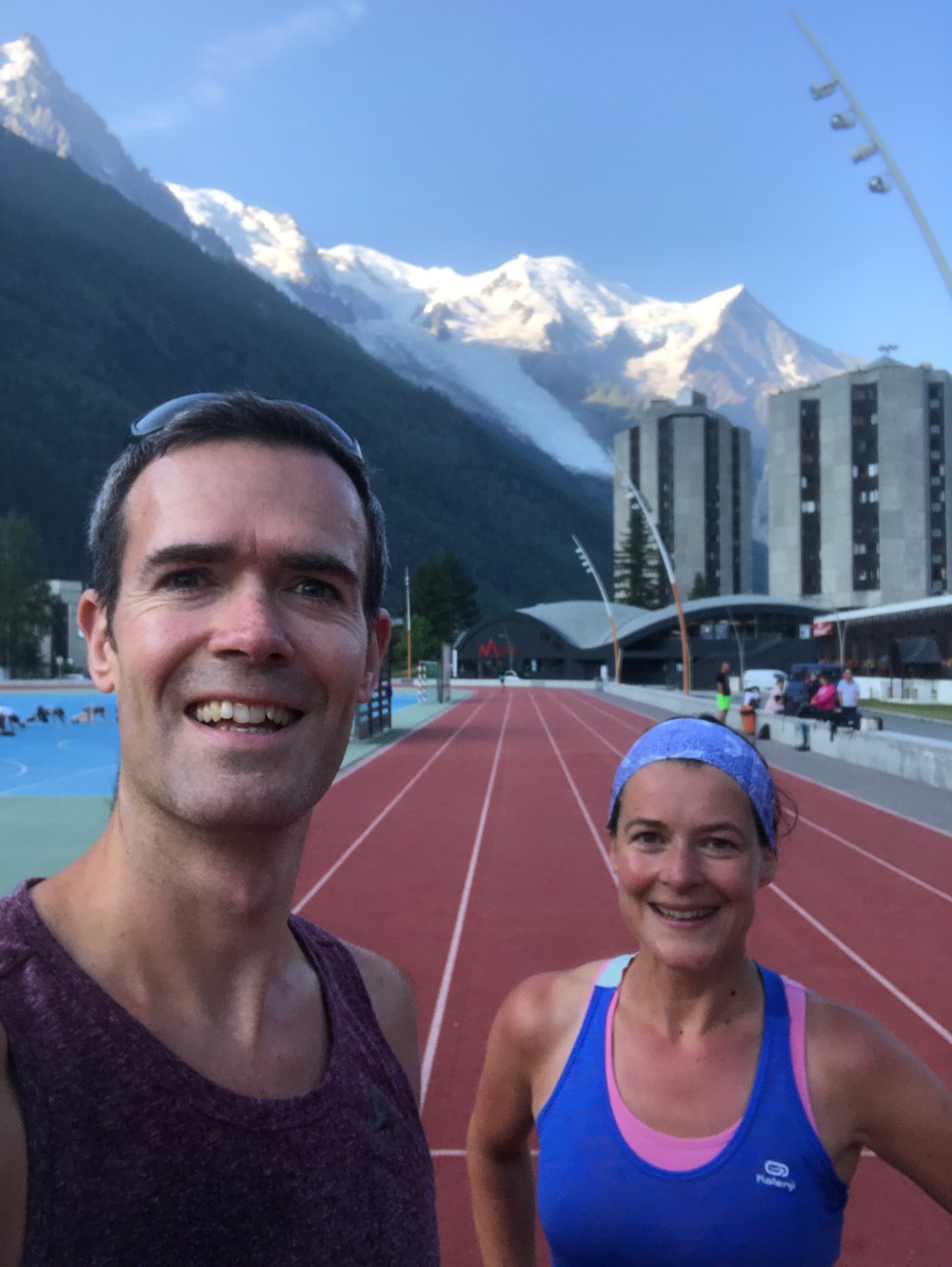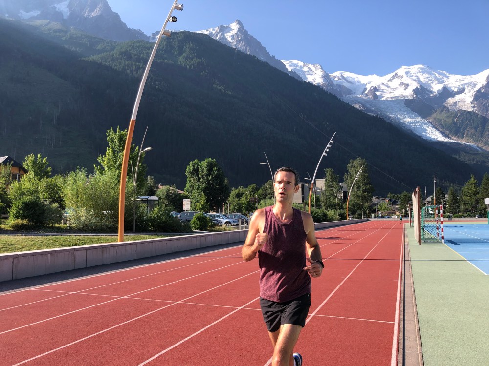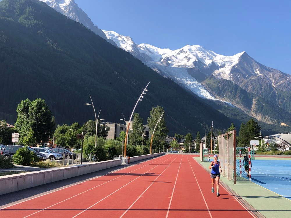 We discovered before we left the UK that Chamonix has an athletics track, and we committed to do a track session. So after a warm up along the river, we hit the track for a session of 8 x 600m, each rep being 2 laps of the track which was actually 300m, presumably due to space constraints.