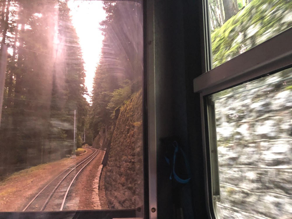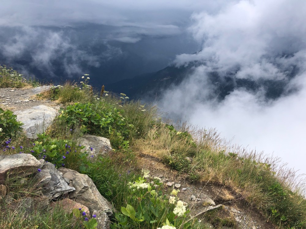 We knew from the forecast that storms were coming, and as it was spitting gradually harder, it felt like a bit of a race to get to the Refuge where we had a Rendezvous with a highly recommended omelette montagnarde! We were incredibly lucky as the storm hit within minutes of our arrival. The cloud completely enveloped us, the lightning and thunder was ferocious, and the cable car was shut down immediately – it seemed we might be settling in for a while!