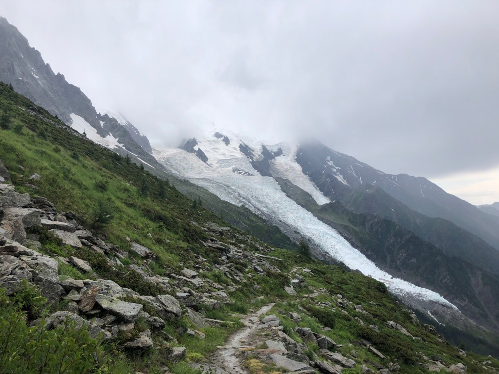 The storm fortunately passed through the valley, and once the rain had subsided enough, we ventured outside and started our descent. The route took us across rather satisfyingly to the glacier we’d been looking at all week from our balcony, and then dropped down through the trees to Chamonix.
